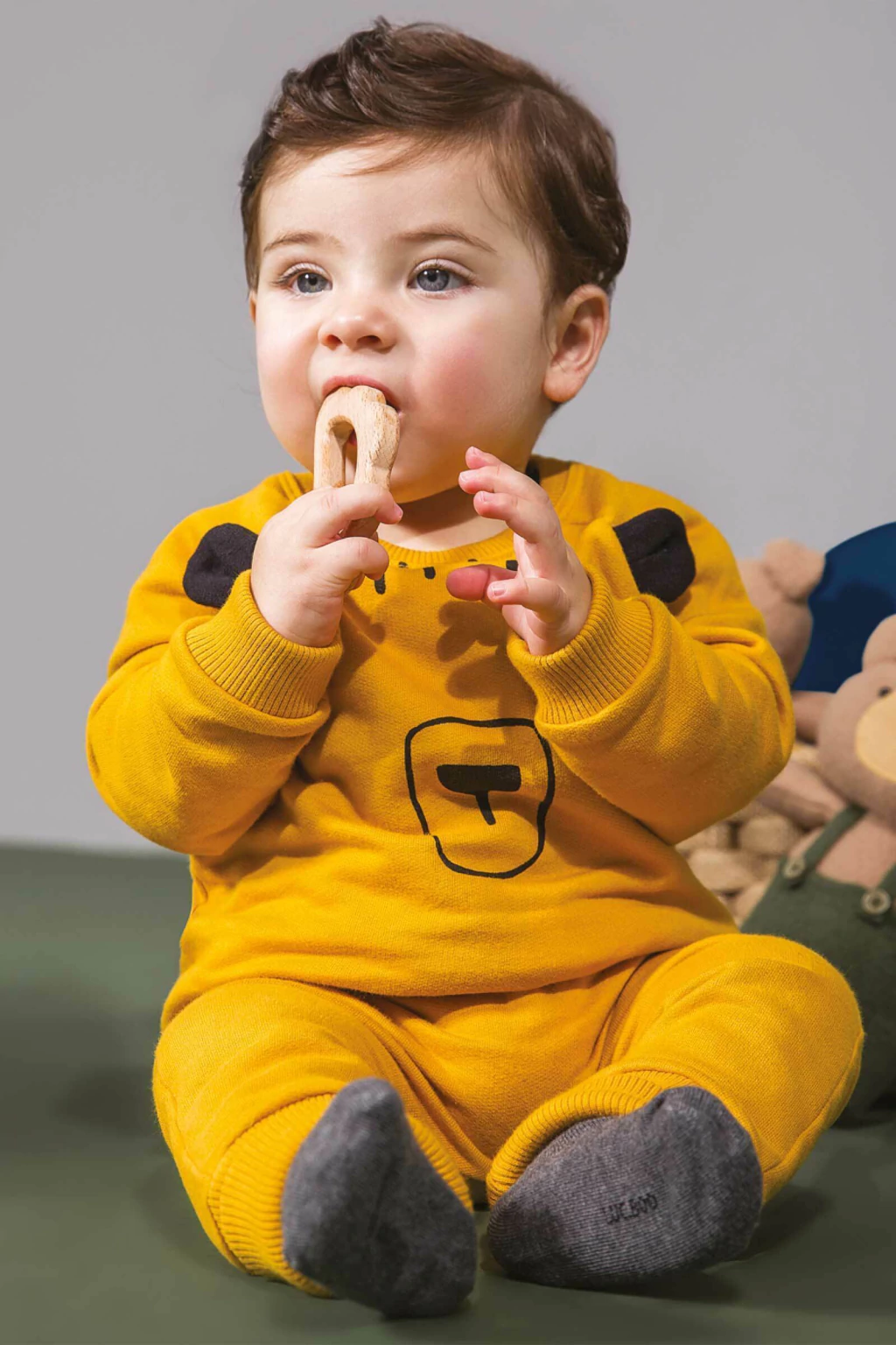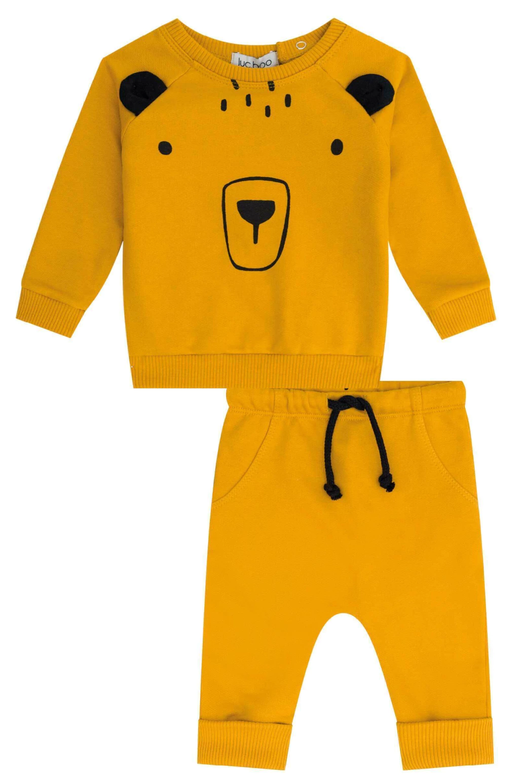 Conjunto de peças mostarda de ursinho, composto por uma blusa com detalher de orelhinhas e uma calça comprida com cordão.