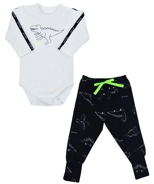 Conjunto de Dinossauro contem uma blusa bordada e calça preta estampada com laço.
