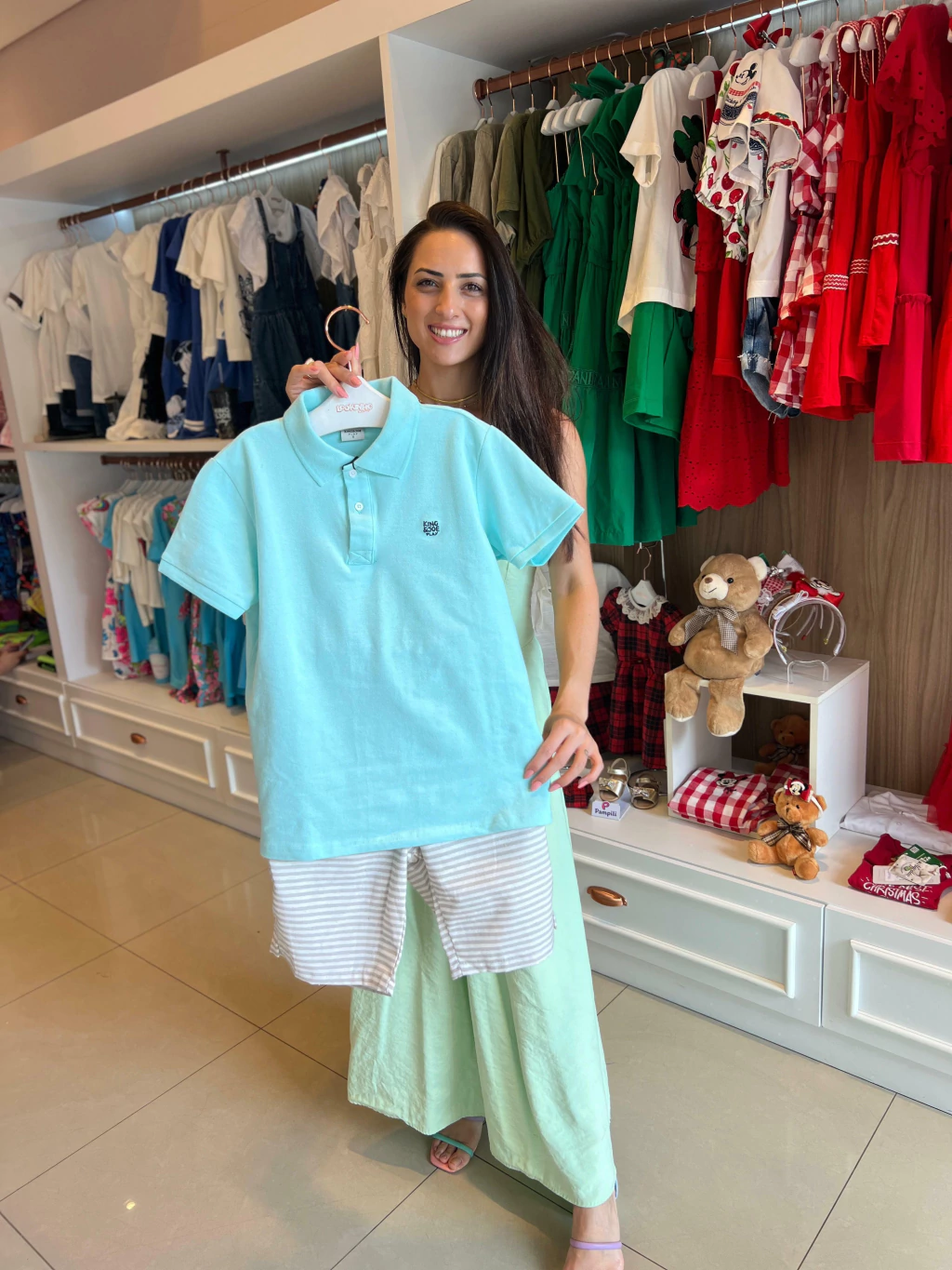 Estilo e conforto em um só look! O conjunto da King e Joe Play vem com uma polo turquesa elegante e uma bermuda listrada super charmosa. Ideal para passeios e ocasiões especiais, sem abrir mão da leveza e liberdade que os pequenos precisam.