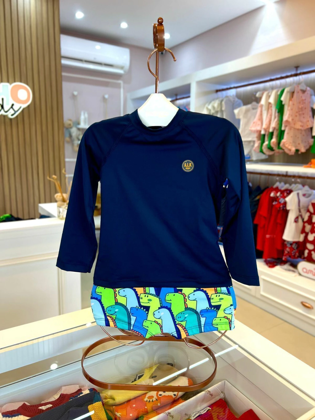 Diversão e estilo para os pequenos exploradores! Composto por blusa de manga longa azul com estampa divertida de dinossauro e shorts combinando, este conjunto une conforto, proteção e muito charme para aproveitar os dias de sol com segurança.