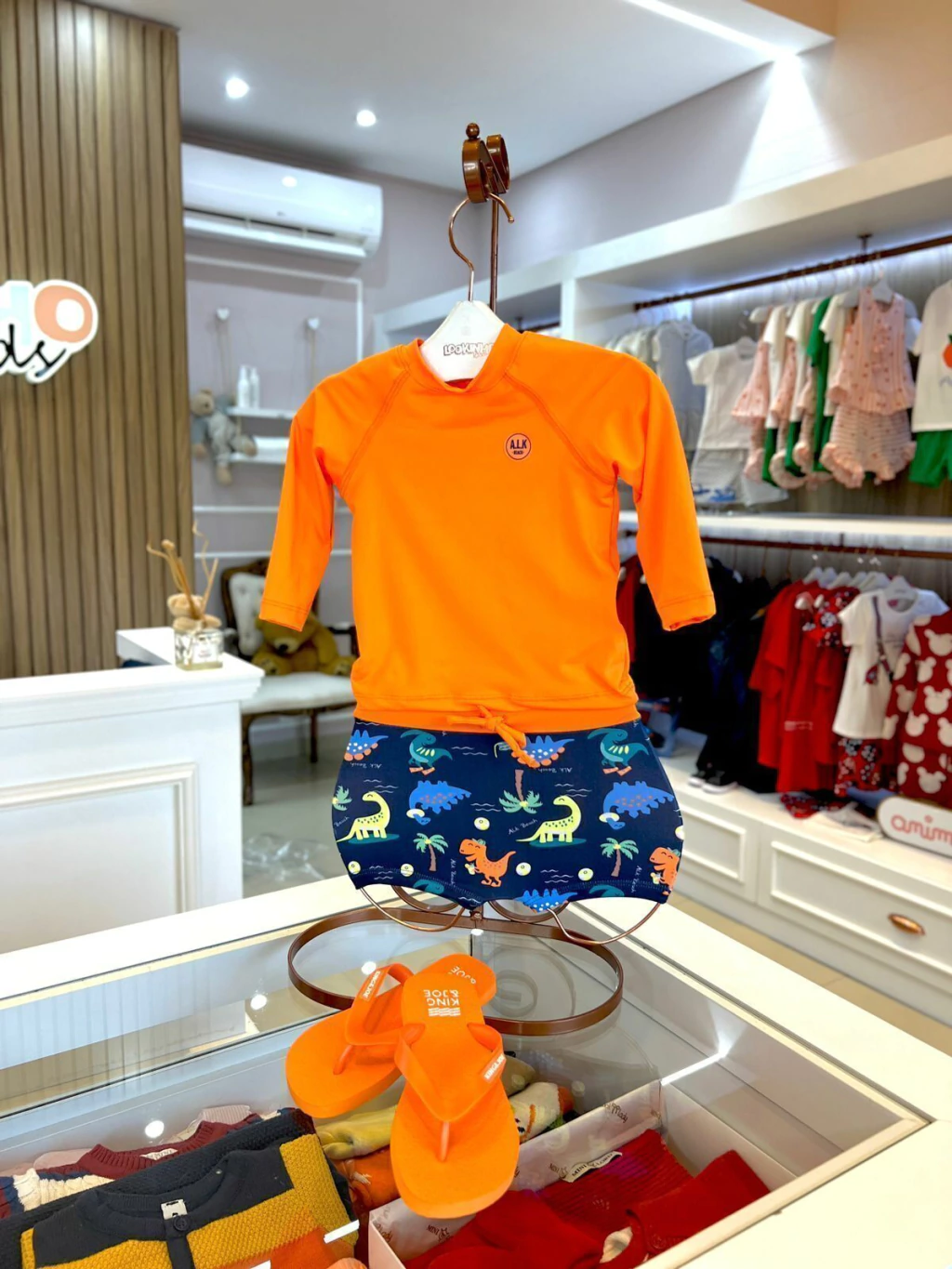 Vibrante e cheio de energia! Este conjunto de praia traz camiseta de manga longa e shorts na cor laranja, perfeito para garantir conforto, proteção e estilo nos dias ensolarados. Ideal para as crianças aproveitarem a praia ou piscina com muita diversão.