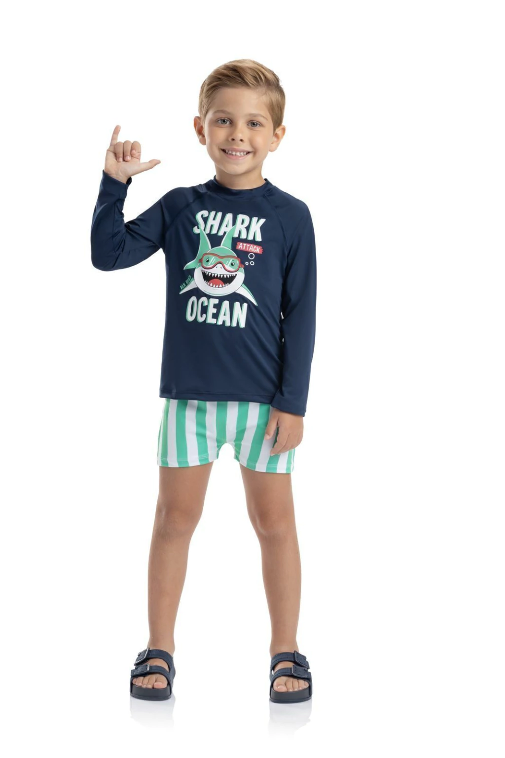 Diversão garantida com o nosso conjunto praia tubarão! Com estampa radical e cores vibrantes, ele é perfeito para os pequenos aventureiros que adoram o mar. Confortável, estiloso e com proteção para brincar o dia todo com segurança.