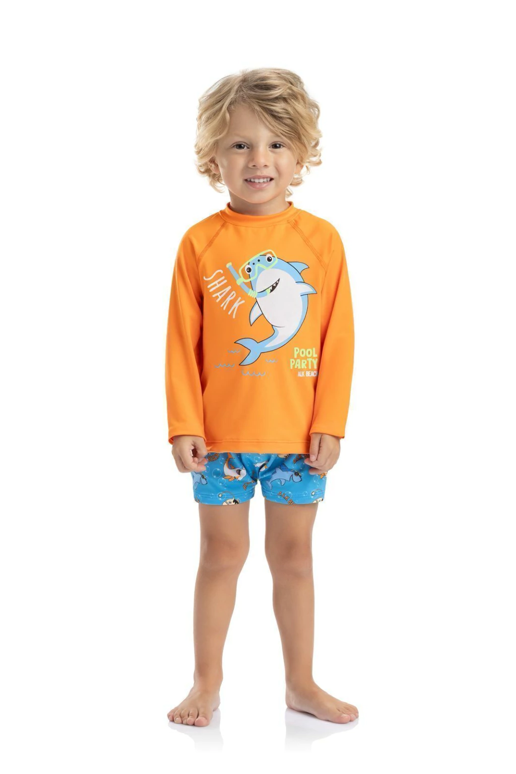 Aventure-se com estilo neste conjunto vibrante! Com camiseta de manga longa laranja estampada com tubarões e shorts combinando, este conjunto oferece conforto e proteção para os pequenos exploradores curtirem o sol com muita diversão e segurança.