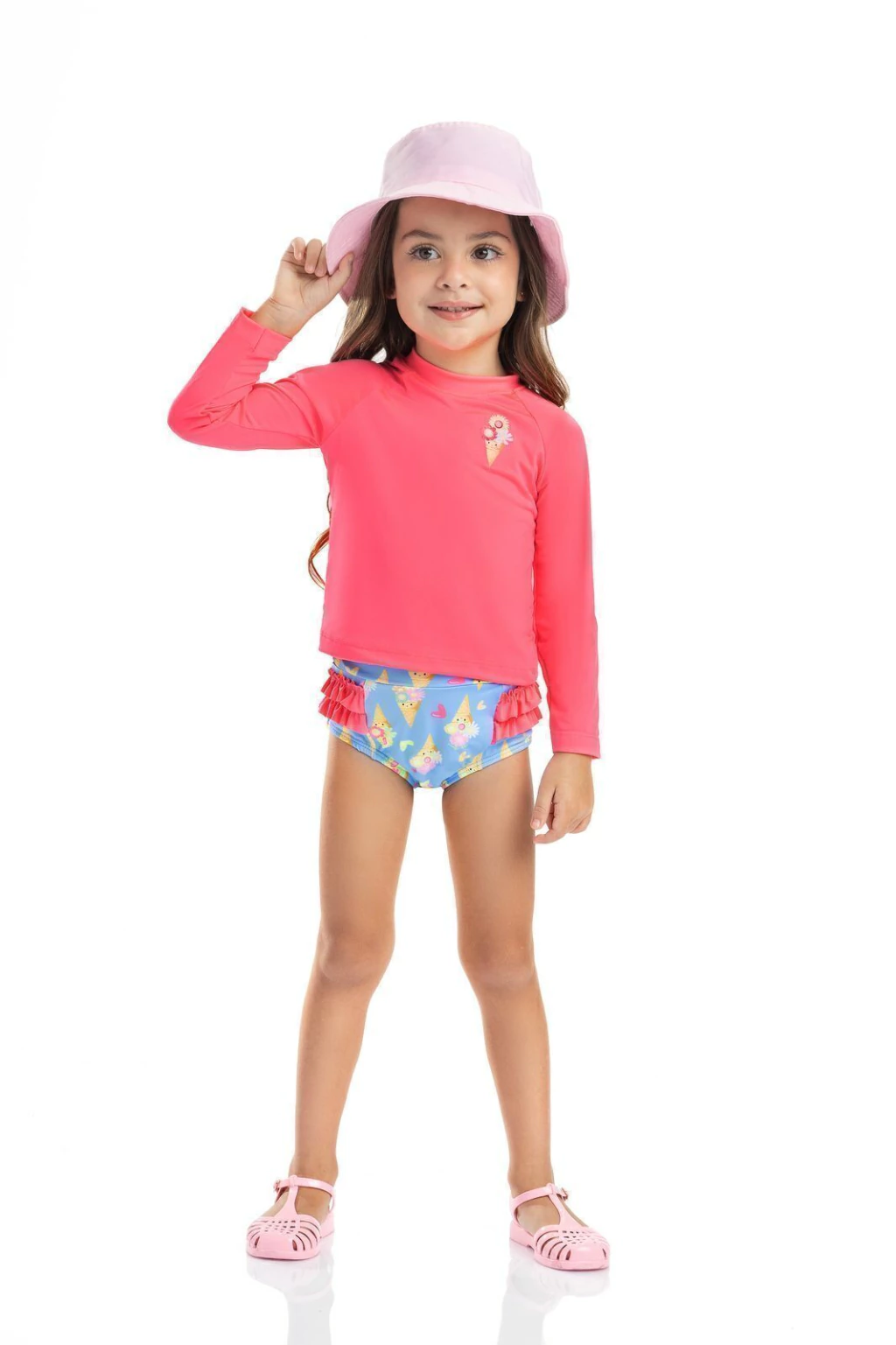 Um verão cheio de sabor e diversão com o Kit Praia Sorvetinho! Composto por blusa de manga longa, calcinha confortável e chapéu bucket, esse conjunto oferece proteção e estilo para as pequenas aproveitarem o sol com muito charme e segurança.