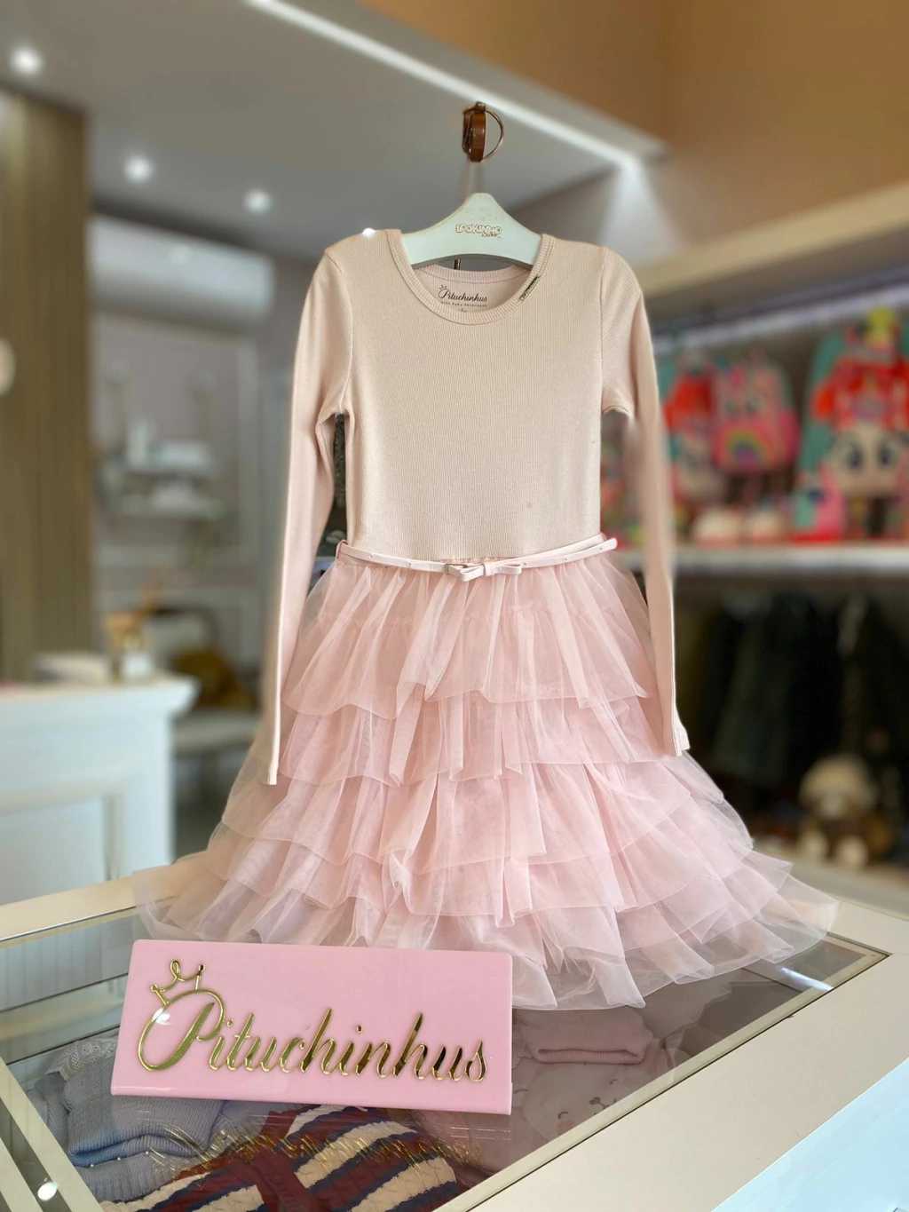 Vestido de Babados de tule com cinto de laçinho, tecido na cor rosa bebê.